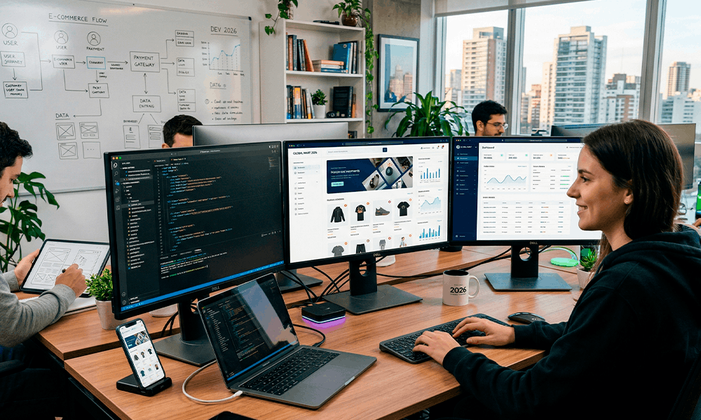 Construimos ecosistemas digitales de alto rendimiento bajo la premisa Mobile First, creando sitios ultra-rápidos y visualmente impactantes que ofrecen una experiencia de usuario superior en cualquier dispositivo. Nuestras soluciones de arquitectura web y tiendas online escalables integran pasarelas de pago modernas, gestión de stock inteligente y una optimización SEO Core nativa que asegura que tu marca no solo tenga presencia, sino que lidere los resultados de búsqueda orgánica con una plataforma sólida y eficiente.